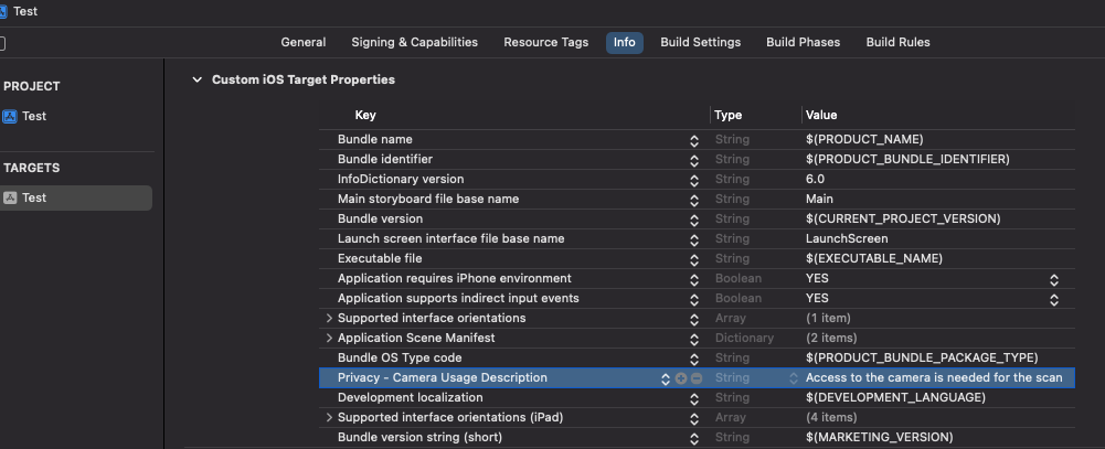 NOTE: Add camera usage description to the app Info.plist: